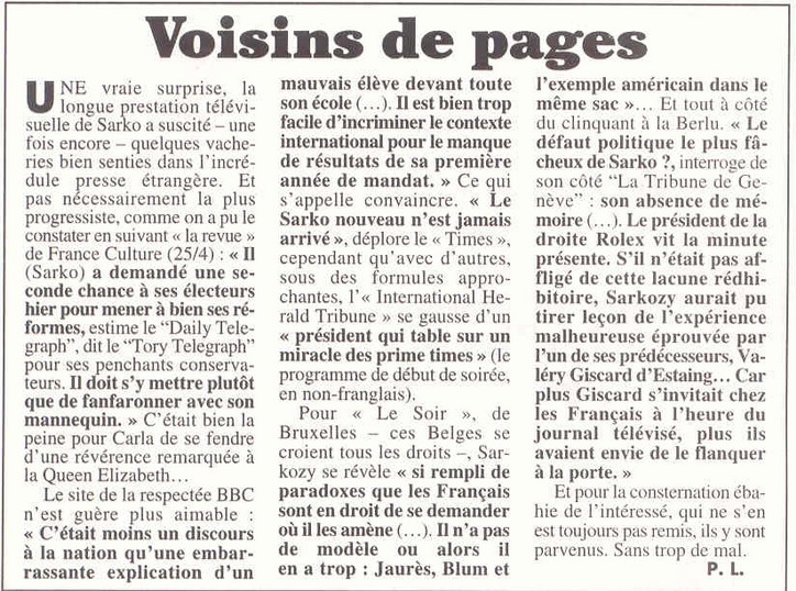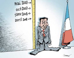 Nicolas Sarkozy, par enthousiasme, s'est fourvoyé encore plus avant : il a péché par excès de "grandeur", c'est la reprise ridicule de la " politique de civilisation" d'Edgar Morin, et par excès de minuscule, c'est le président micro-manager qui décide du moindre détail de tout. Le "volontarisme" s'est, bien entendu, heurté "aux choses". Le choc de confiance n'est pas venu, au contraire, et l'incohérence a troublé la politique macroéconomique du pays. N'y revenons pas. … Un an après, … le retour "aux choses", aux réalités, n'est donc pas encore achevé mais il se dessine. … Ni de Gaulle ni Zorro, donc. Tant mieux ! Président pragmatique, il se veut l'homme qui "va faire les réformes". Si tel est le cas, c'est historiquement bien suffisant pour remplir un mandat. … … Ce qu'il faut faire est archi-connu, il y a trois volets de réformes : le travail, l'école, l'État. Même la gauche partage le diagnostic. Alors, fi des grands discours, de la belle rhétorique, des leçons données au monde entier : aux réformes ! … … Curieusement, ce sont les réformes d'inspiration "de gauche" qui sont poussées le plus loin : le RSA, la télé publique sans pub et, révolution, la représentativité syndicale qui mise sur une CGT réformiste. Pour le reste, l'administration syndiquée et l'UMP sont les vraies forces de résistance, plus que l'opinion. C'est là qu'il faut porter non plus le volontarisme mais la volonté. Eric Le Boucher - LE MONDE - 26.04.08