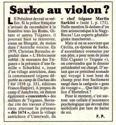 Le chef de l'État devrait en être le garant. Il invite à le bafouer, sans craindre de recréer en France une catégorie de résidents qui ne seraient ni citoyens ni expulsables, puisque Français par la naissance. Autrement dit, des apatrides. En dépit du fiasco, il y a six mois, du débat sur l'identité nationale, cette politique du bouc émissaire est aussi détestable que condamnable. Aucune fin - ni la protection indispensable des citoyens ni une réélection espérée à la présidence de la République en 2012 - ne justifie tous les moyens. Le Monde - édition du 03.08.10. Article du Canard Enchaîné - 18.8.10 - Voir aussi lemonde.fr/.../2010/08/18/... Tartarin à l'ÉlyséeEst-ce l'effet de ses vacances provençales ? Ou la lecture assidue, qui sait, de Pagnol ou d'Alphonse Daudet ? Impossible de trancher, mais le résultat est là : le président de la République a passé son été entre galéjades et tartarinades. Les premières, pour qui l'aurait oublié, sont des "histoires exagérées destinées à mystifier", précise le Petit Robert ; les secondes évoquent, sans garantie de l'Académie, les histoires à dormir debout de l'impérissable chasseur de lions de Tarascon... Depuis son élection, il n'a échappé à personne que le plus grand bavard de la République est son président... Pire, quand l'Independant britannique fustige les "amalgames au mieux délibérés, au pire malhonnêtes" pratiqués par le président français, quand le New York Times s'inquiète de le voir "attiser dangereusement les sentiments hostiles aux immigrés pour satisfaire ses objectifs politiques de court terme", quand la Süddeutsche Zeitung estime que "Nicolas Sarkozy multiplie les gesticulations, croyant démontrer sa force alors qu'il révèle ainsi sa faiblesse", quand La Vanguardia catalane se demande si "la France est un pays raciste", quand enfin le pape lui-même s'en mêle pour rappeler à qui de droit les règles élémentaires de la charité chrétienne, c'est le crédit du chef de l'État et, au-delà, l'image du pays qui en prennent un sacré coup. De cela, aussi, le chef de l'Etat semble ne pas se sentir comptable. La certitude d'avoir raison envers et contre tous n'est jamais la meilleure conseillère. Gérard Courtois Par Bruno-Roger Petit :... J'ai aimé, d'un certain point de vue, même ceux que j'ai le plus vilipendé, tous les présidents de la Ve République. J'y ai vu, j'y vois encore des monuments français. Chacun d'entre eux, à sa façon, compte tenu de ses qualités, incarna une part de l'esprit français, de son histoire, de sa culture, de ses tradition de ses ambitions. Ils ont été les marqueurs d'une continuité, ne cherchant jamais à rompre le fil de l'Histoire française, et si l'un d'entre eux parla de rupture, cela ne concernait que le capitalisme, pas la France. De Gaulle fut le président des idéalités nationales, rêvant d'une France plus grande que ne l'est parfois le peuple français, entre France et Concorde, tante Yvonne et baby boom, Charlemagne et Napoléon. Pompidou fut le président des notabilités paysannes, réinventant le rêve "bien de chez nous" d'une grande France industrielle, entre bon sens paysan et avant-garde branchée, DS et camembert, Colbert et Guizot. Giscard fut le président des contradictions françaises, ressuscitant une sorte de despotisme éclairé façon république décrispée, entre dîners chez les Français moyens et diamants de Bokassa, Loi Veil et loi Peyrefitte, François Ier et Louis XV. Mitterrand fut le président des ambiguïtés provinciales, incarnant cette palette des passions françaises qui va du gris clair au gris foncé, entre abolition de la peine de mort et écoutes illégales, Badinter et Tapie, Louis XI et Richelieu. Chirac enfin, fut le président des fatalismes cocardiers, considérant que les Français savent mieux ce que qu'ils ne veulent pas plutôt que ce qu'ils veulent, entre suppression du service militaire et CPE, Raffarin tout mou et Villepin tout raide, Louis-Philippe et Albert Lebrun. Depuis 2007, on s'interroge. A qui, à quoi rattacher l'actuel président de la République ? Serait-il capable par exemple, de citer, comme aimaient à le faire de Gaulle et Mitterrand, tous les souverains, tous les régimes, ayant gouverné la France depuis 987 ? Sans doute non. Du reste, depuis des années, on ne compte plus ses saillies contre l'histoire de France, la culture classique, la littérature, les humanités. Comment ne pas voir que cette haine de la France est à l'origine de la disparition sournoise et progressive des programmes d'histoire, de latin, de grec dans les collèges et lycées, le tout sous la houlette de l'ignare Luc Chatel ?.. Le Post 2/8/2010 ... L'autre jour, dans le bistrot où je lis le Monde quotidiennement en buvant mon 51, j'ai été le témoin d'une conversation comme je les aime, authentiquement française. J'ai vu, et surtout entendu, des attitudes et des propos qui m'ont montré le rejet qui frappe la personne du chef de l'État français au sein de l'électorat de la droite française, y compris le plus populaire, le plus modeste ; cet électorat pour qui le mot "travail" a un sens sacré depuis des générations, et qui a découvert de ce que le mot "bling bling" siginifiait depuis 2007. Tout y est passé. Le "discours bidon sur la sécurité", "Besson, un mec qui trahit y trahira encore !", "Sa nana qui chante en play back qu'on se demande si c'est vraiment elle", "Fillon qui sert à rien", "Woerth le petit père des riches", "Obama il est obligé de s'asseoir pour lui parler d'homme à homme", "Y parle tout le temps et y fait rien", "Y s'est fait construire une baignoire dans son avion, on va se marrer si y a un trou d'air !"... Mon jardinier, qui participait à ce débat sur les agitations présidentielles a dit : "Quand tu penses que c'est lui qui appuie sur le bouton de la bombe atomique !" Et tout le monde l'a approuvé... lepost.fr/article/2010/08/04/... 